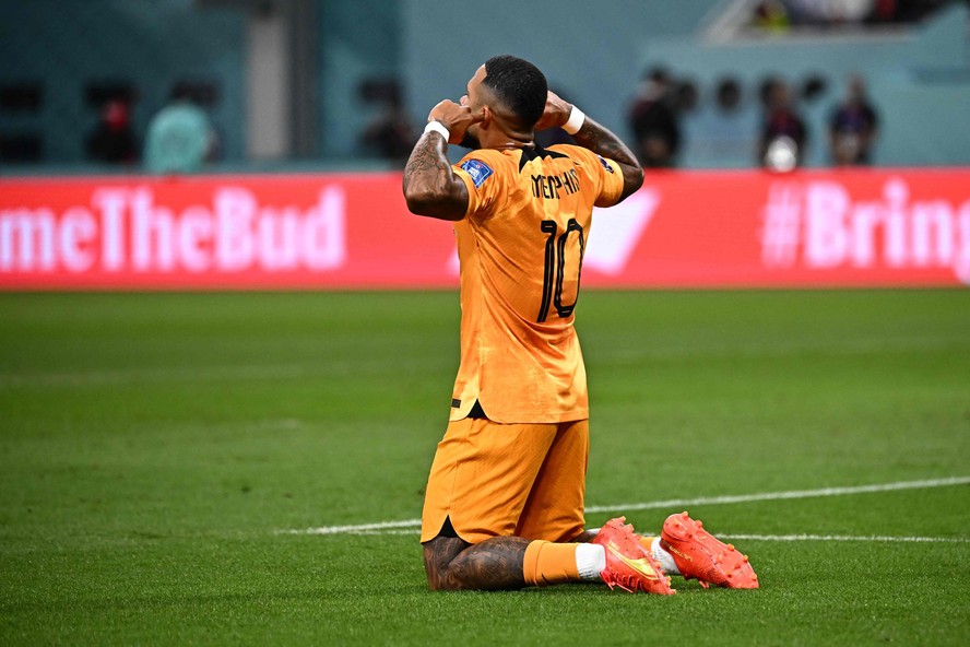 Memphis Depay,da Holanda,e sua típica comemoração tapando os ouvidos — Foto: Anne-Christine Poujoulat/AFP