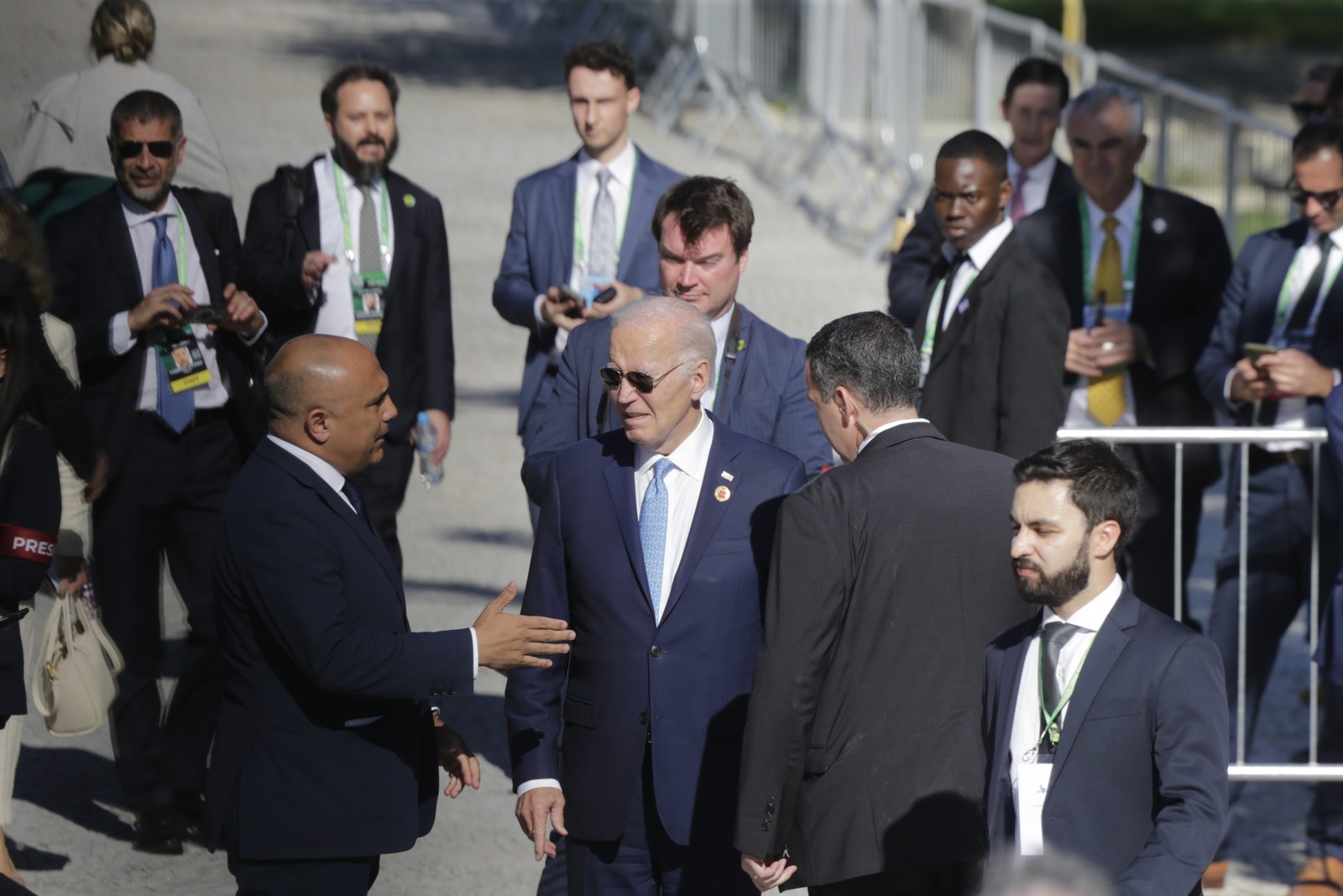 Presidente dos Estados Unidos,Joe Binden,acabou não participando desse primeiro registro. Ele chegou ao local da foto pouco depois do registro — Foto: Domingos Peixoto / Agência O Globo