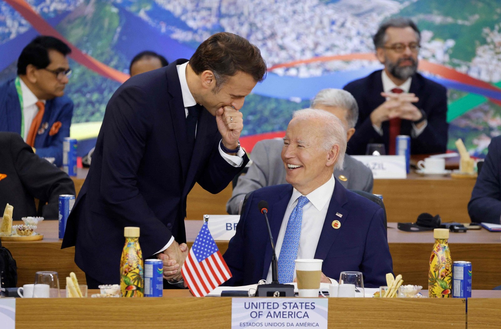 Macron e Biden conversam durante a cúpula do G20 — Foto: Ludovic MARIN / AFP
