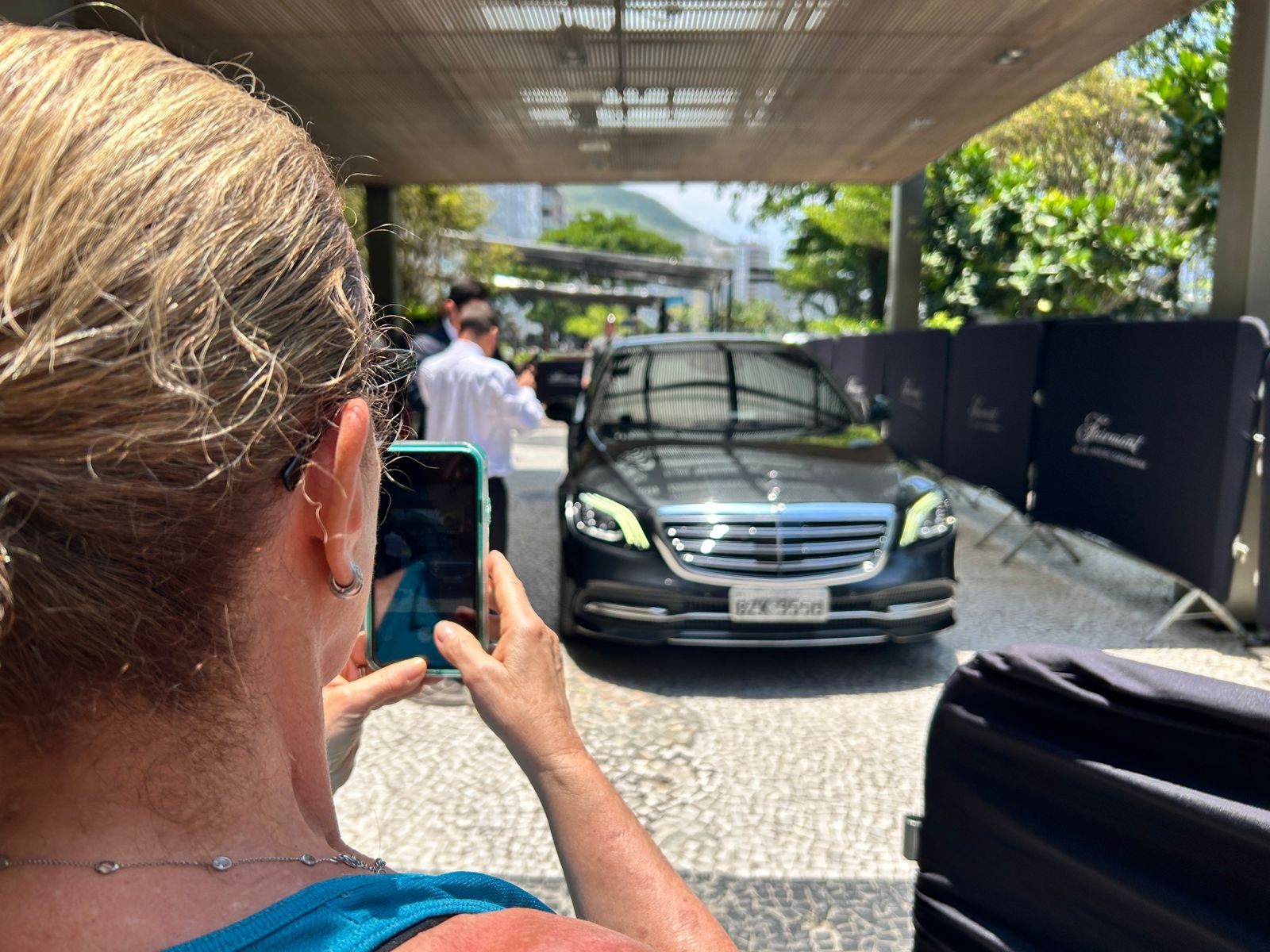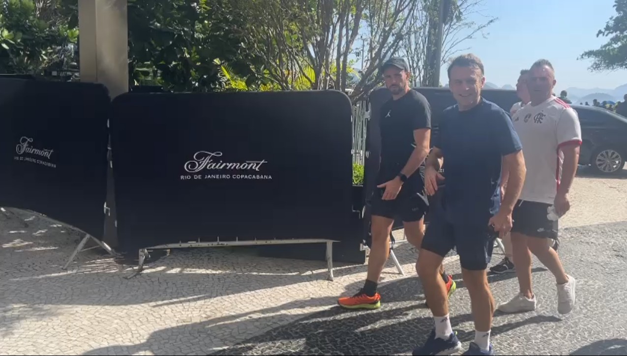 Presidente da França,Emmanuel Macron,volta ao hotel depois de corrida na orla do Rio; ele está na cidade para o G20 — Foto: Agência O Globo