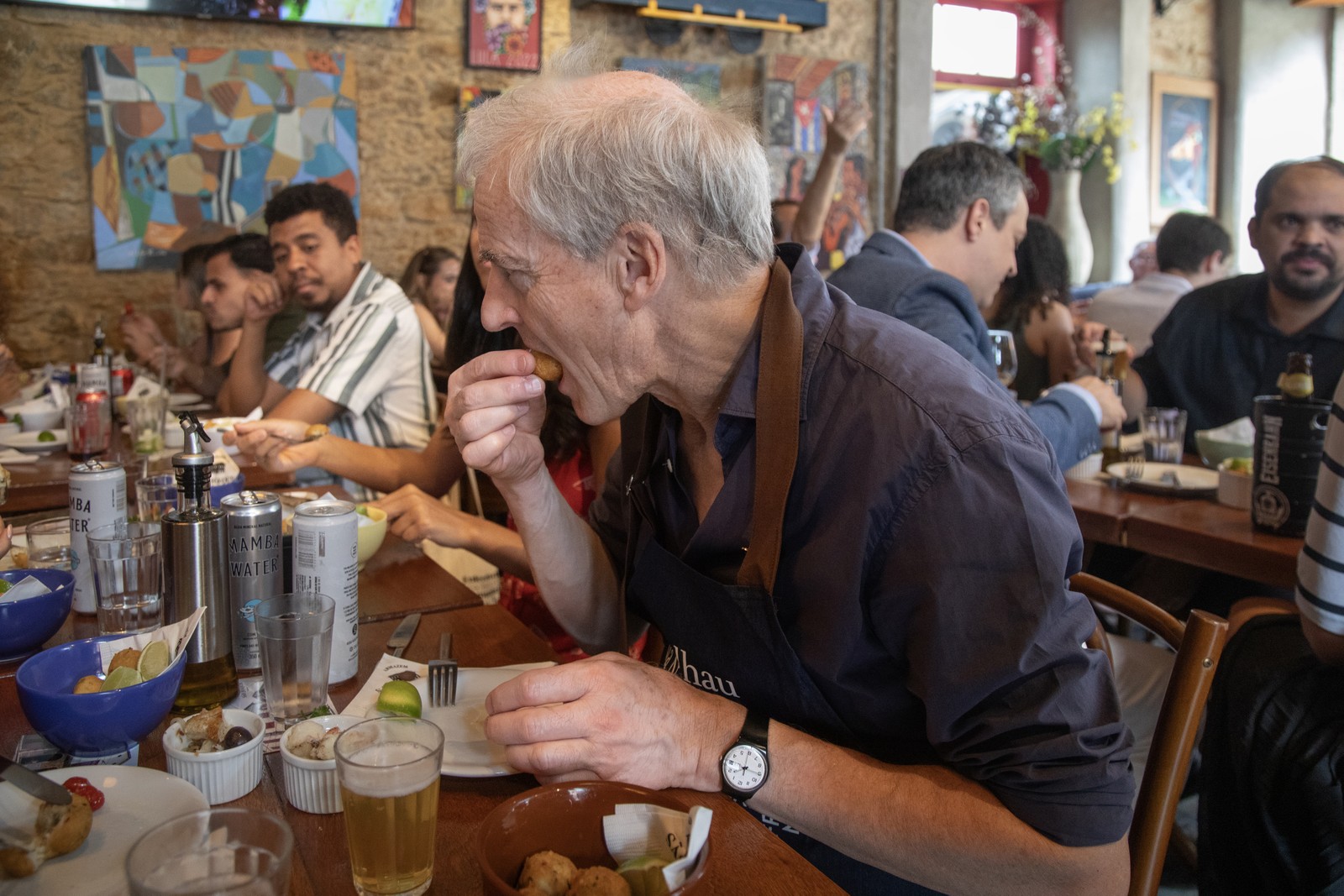 Primeiro ministro da Noruega Jonas Gahr Støre chegou até Santa Teresa de bondinho e foi para o Restaurante Armazem São Joaquim,onde serviu os clientes com iscas e bolinhos de bacalhau — Foto: Ana Branco / Agencia O Globo