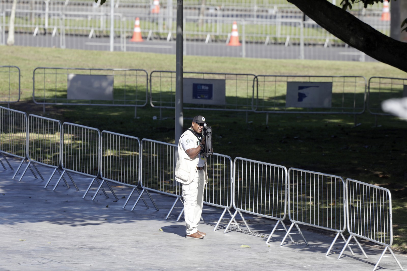 OO entorno do MAM teve a segurança reforçada durante o primeiro dia da Cúpula do G20 no Rio de Janeiro. Na foto,arma contra drone — Foto: Gabriel de Paiva / Agência O Globo