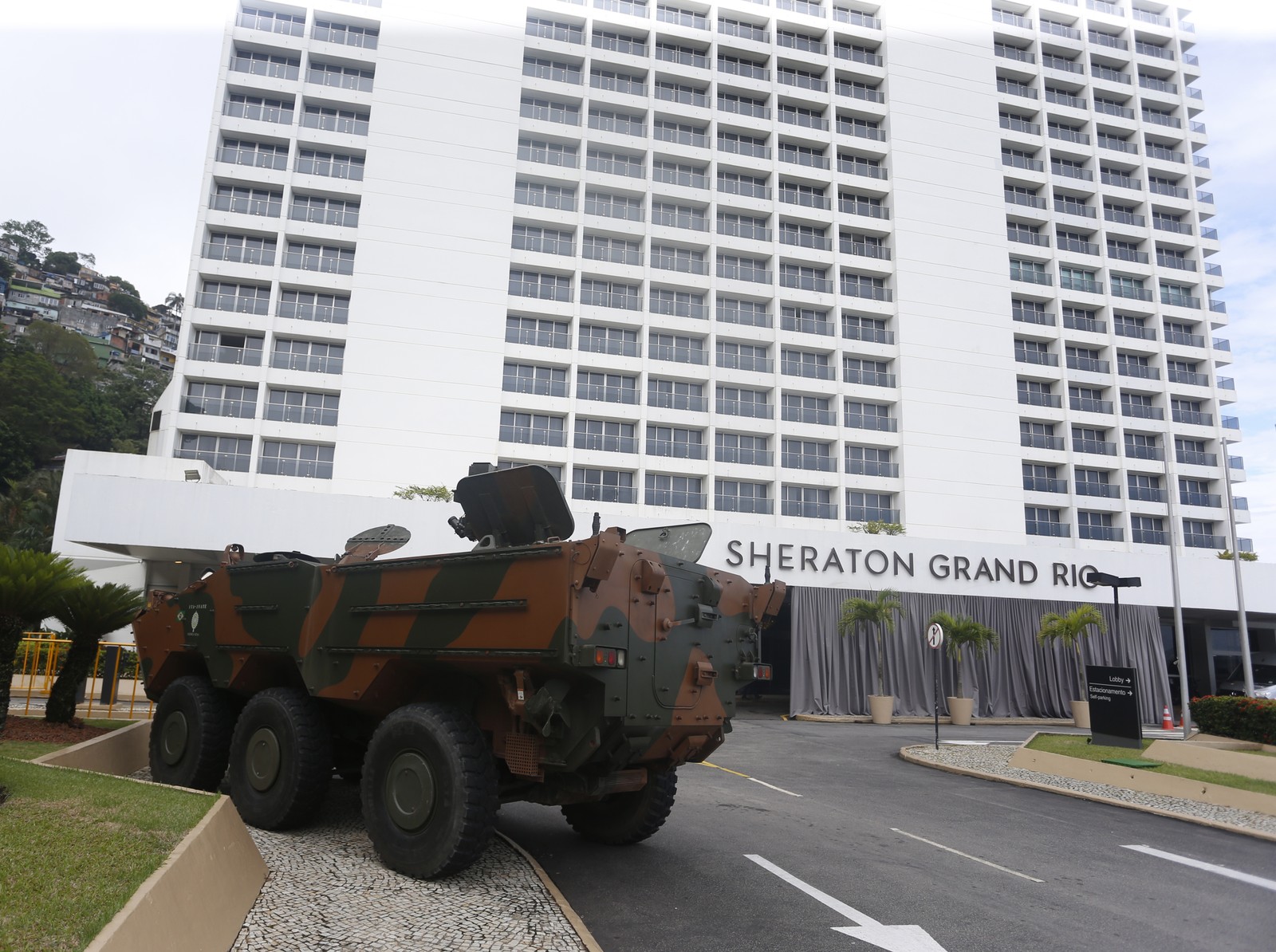 Forças Armadas contribuem para a segurança do G20 - Na foto,um viatura em frente ao Sheraton Grande Rio,onde a delegação chinesa ficou — Foto: Fabiano Rocha / Agência O Globo