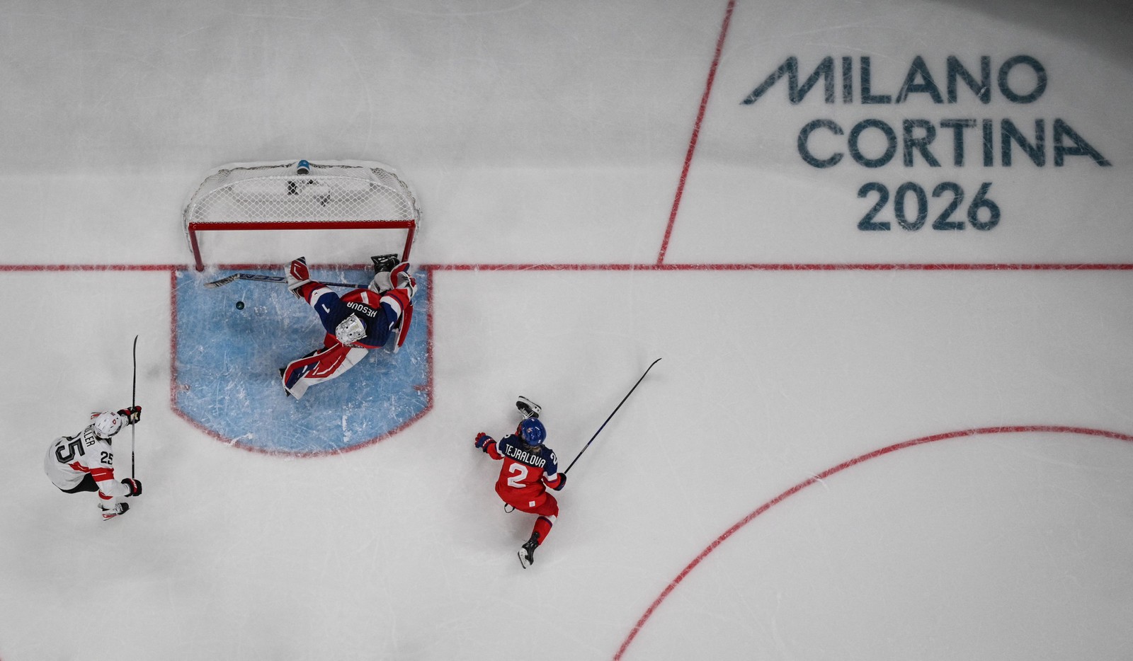 A atacante suíça no 25,Alina Muller (E),chuta e marca o segundo gol de sua equipe durante a partida da fase preliminar do Grupo A do hóquei no gelo feminino entre República Tcheca e Suíça,na Arena de Hóquei no Gelo Milano Santagiulia,nos Jogos Olímpicos de Inverno de Milão-Cortina 2026,em Milão,em 6 de fevereiro de 2026. — Foto: Wikus de WET / AFP