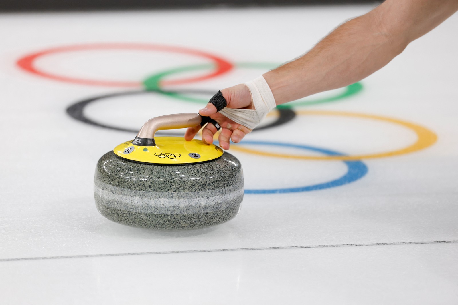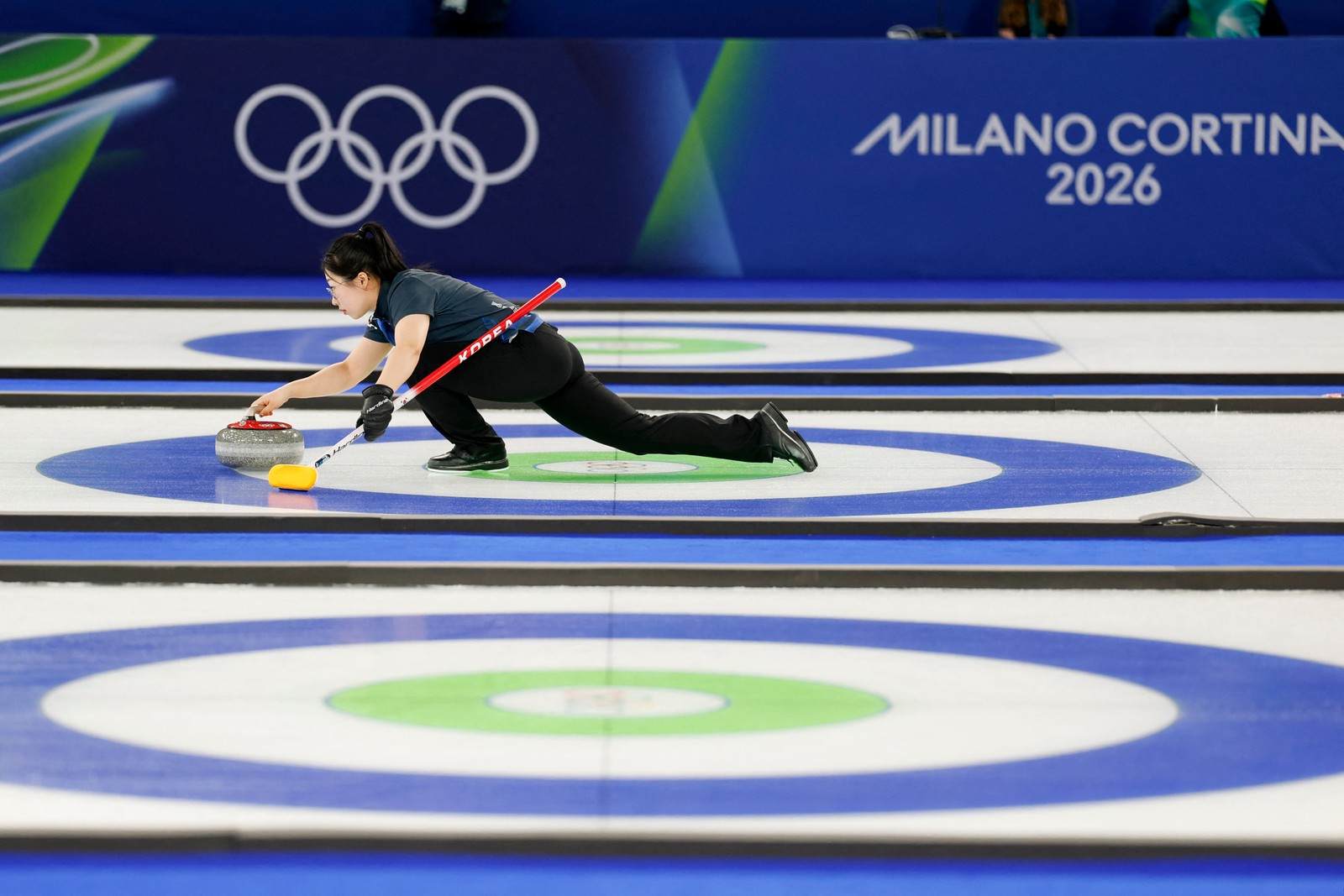 O sul-coreano Kim Seonyeong lança a pedra no torneio de duplas mistas de curling entre Coreia do Sul e Grã-Bretanha durante os Jogos Olímpicos de Inverno de Milão-Cortina 2026,no Estádio Olímpico de Curling de Cortina,em Cortina d'Ampezzo,em 6 de fevereiro de 2026. — Foto: Odd ANDERSEN / AFP