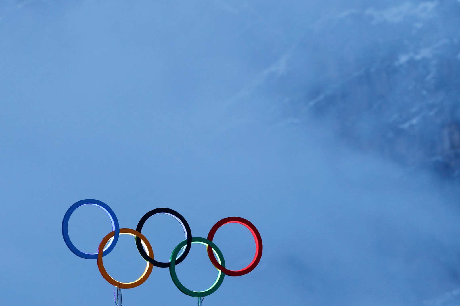 Os anéis olímpicos são vistos em meio à neblina e a uma montanha,em 6 de fevereiro de 2026. — Foto: Odd ANDERSEN / AFP
