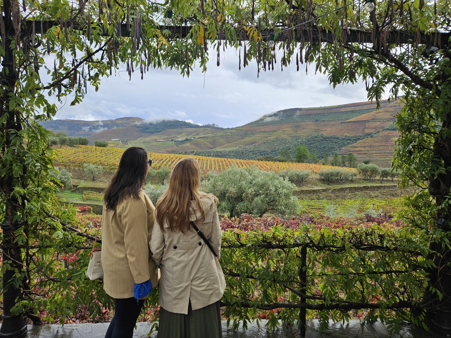 Visitantes se encantam com os parreirais em cores de outono na Quinta da Roêda,no Vale do Rio Douro,norte de Portugal — Foto: Rafael Galdo/O Globo